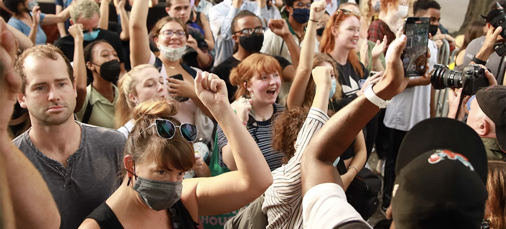 People cheer as they watch the removal of the Lee statue, the largest Confederate monument in Richmond. (photo: Crixell Matthews/VPM)