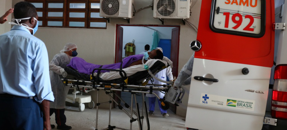 A patient with suspected COVID-19 infection is taken into an ambulance by members of the Emergency Mobile Care Service team, amid the coronavirus disease outbreak, in Duque de Caxias near Rio de Janeiro. (photo: Pilar Olivares/Reuters)