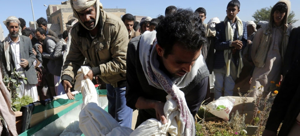 In this file photo from 2017, Yemenis carry the bodies of a child killed in a reported air raid in Sanaa. (photo: Yahya Arhab/EPA)