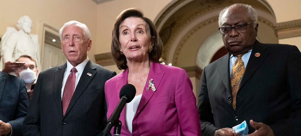 House Speaker Nancy Pelosi (D-CA) accompanied by House Majority Leader Steny Hoyer (D-MD), and House Majority Whip James Clyburn (D-SC) speaks to reporters at the Capitol in Washington, on Friday, Nov. 5, 2021. (photo: Jose Luis Magana/AP)