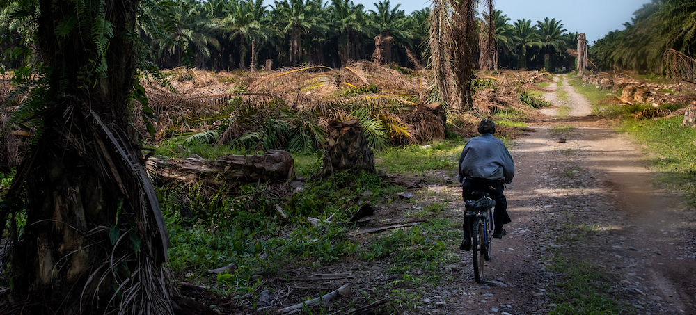 A man rides a bicycle past a lot of felled African palm trees in Los Laureles, Honduras, on July 22, 2021. (photo: Seth Berry/The Intercept)