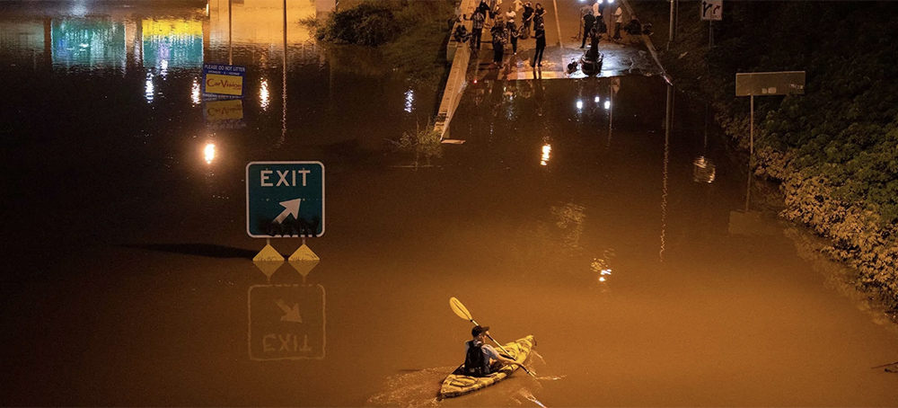 A kayaker paddles down an interstate in Pennsylvania after flooding from Hurricane Ida earlier this year. Several dozen people died, some in cars and basement apartments, during extreme flash flooding. (photo: Branden Eastwood/AFP/Getty Images)
