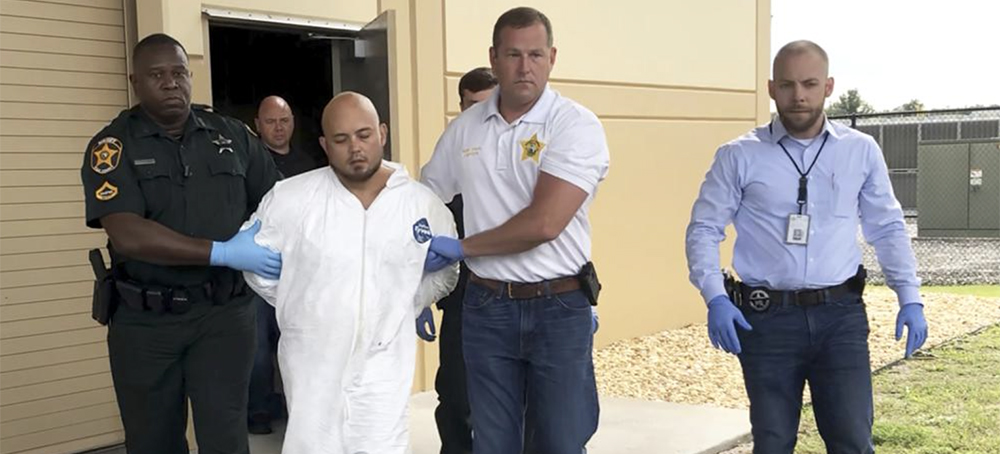 Quadruple murder suspect Bryan Riley is led from the Polk County Sheriff's Office in Lakeland, Fla., on Sunday, Sept. 5, 2021, by Deputy Steve Neil, left, Captain Bart Davis and Detective Brett Bulman. (photo: Kimberly C. Moore/The Ledger/AP)
