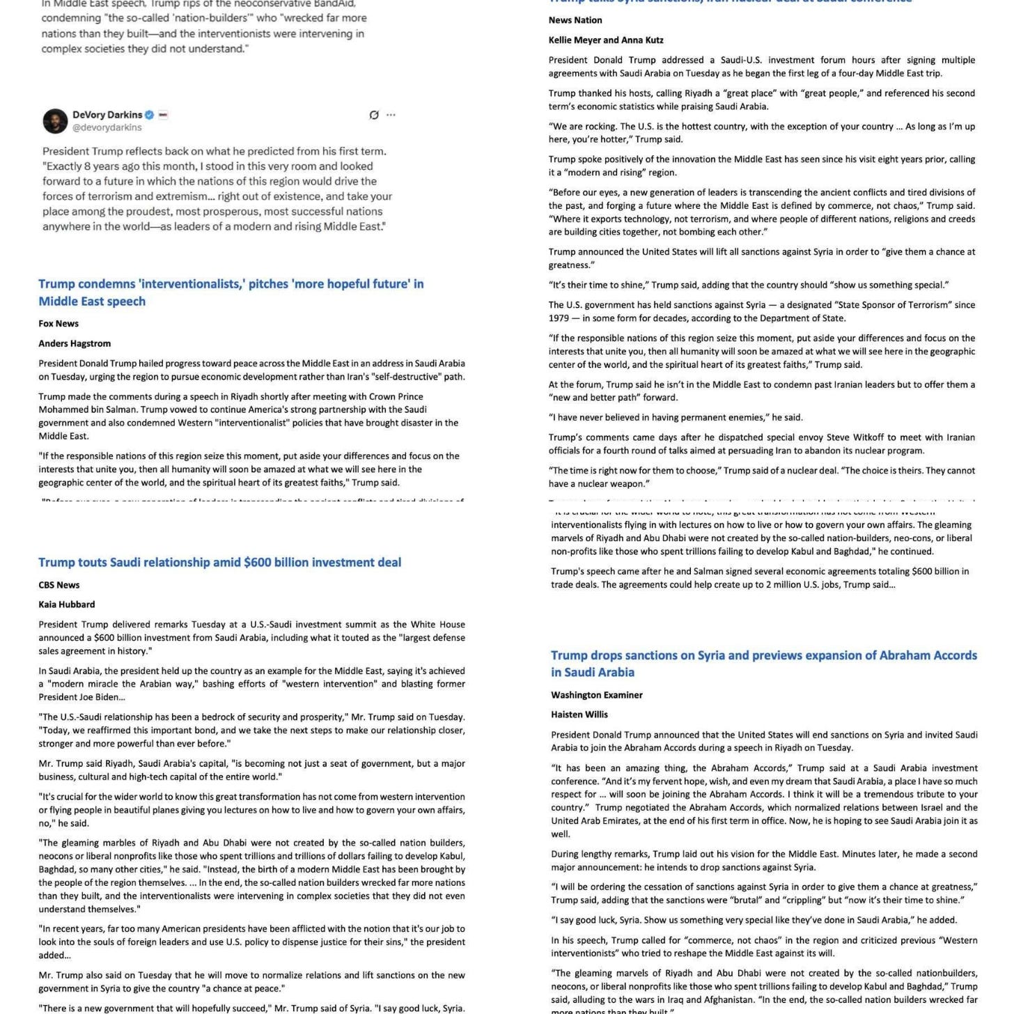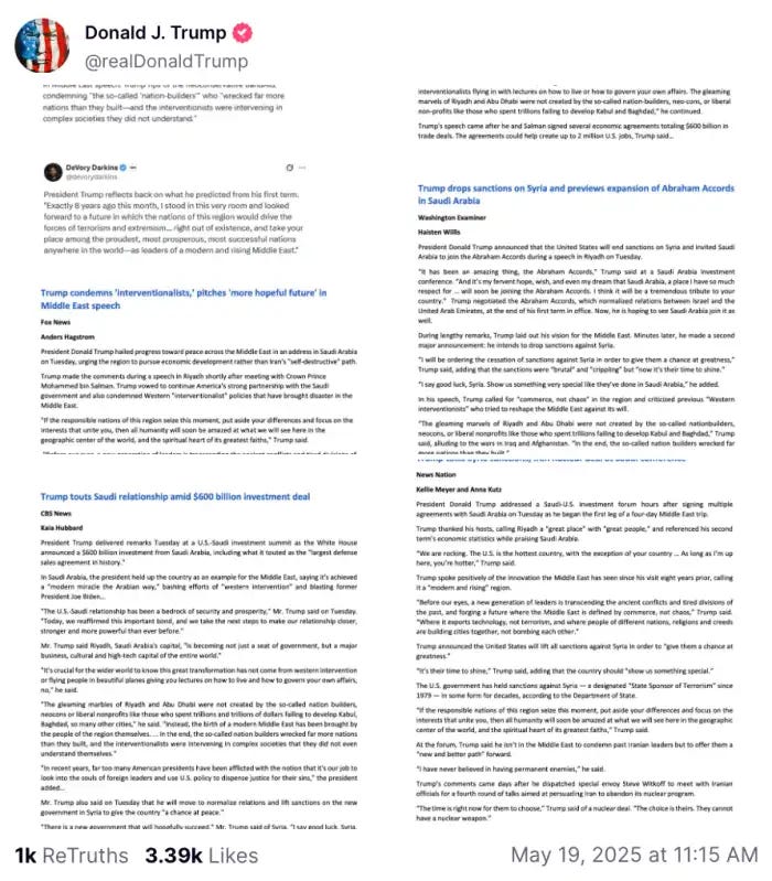 The Art of Omission: Trump Erased Human Rights and Ethics Concerns from His Middle East CoverageTrump shared manipulated articles to his Truth Social platform, omitting critiques and geopolitical realities to craft a glowing portrayal of his diplomacyWritten by J.D. Wolf In a Truth Social post today, Trump shared screenshots of news articles from media outlets highlighting coverage of his recent Middle East trip. Each post prominently features the article titles, publishers—Fox News, Washington Examiner, CBS News, and NewsNation—and writers Anders Hagstrom, Haisten Willis, Kaia Hubbard, Kellie Meyer, and Anna Kutz, giving an appearance of transparency and broad media acknowledgment of his diplomacy. However, a closer examination reveals a pattern of selective omission. Trump’s posts systematically cut away significant portions of the articles that contain criticisms and concerns about his trip, effectively sanitizing the narrative presented to his audience. This propaganda technique makes it appear that the pieces from these outlets are only glowing and positive. MeidasTouch uncovered several omissions when comparing the original articles to Trump's screenshots. Trump's screenshots of redacted news articles![]() Trump's screenshots of redacted news articles