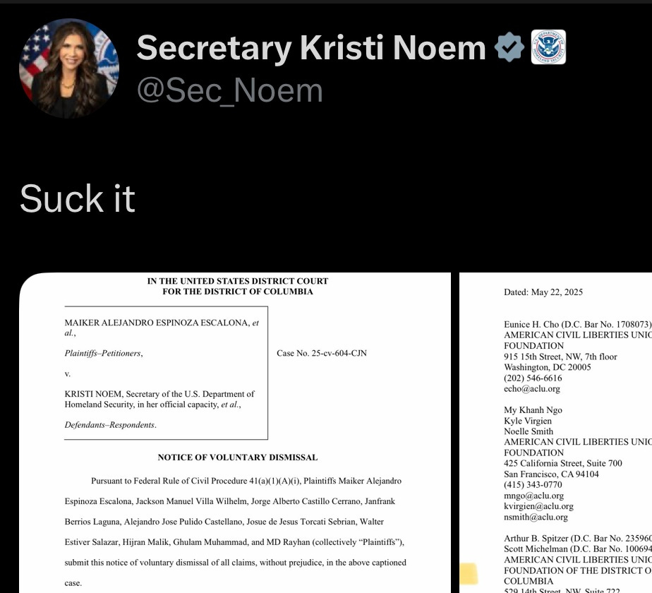 … Attorneys for immigrants dismissed a complaint they previously filed without prejudice, which allows them to refile it at a later time or in a different court. Kristi Noem then posted a copy of the Voluntary Dismissal with this classy caption:
